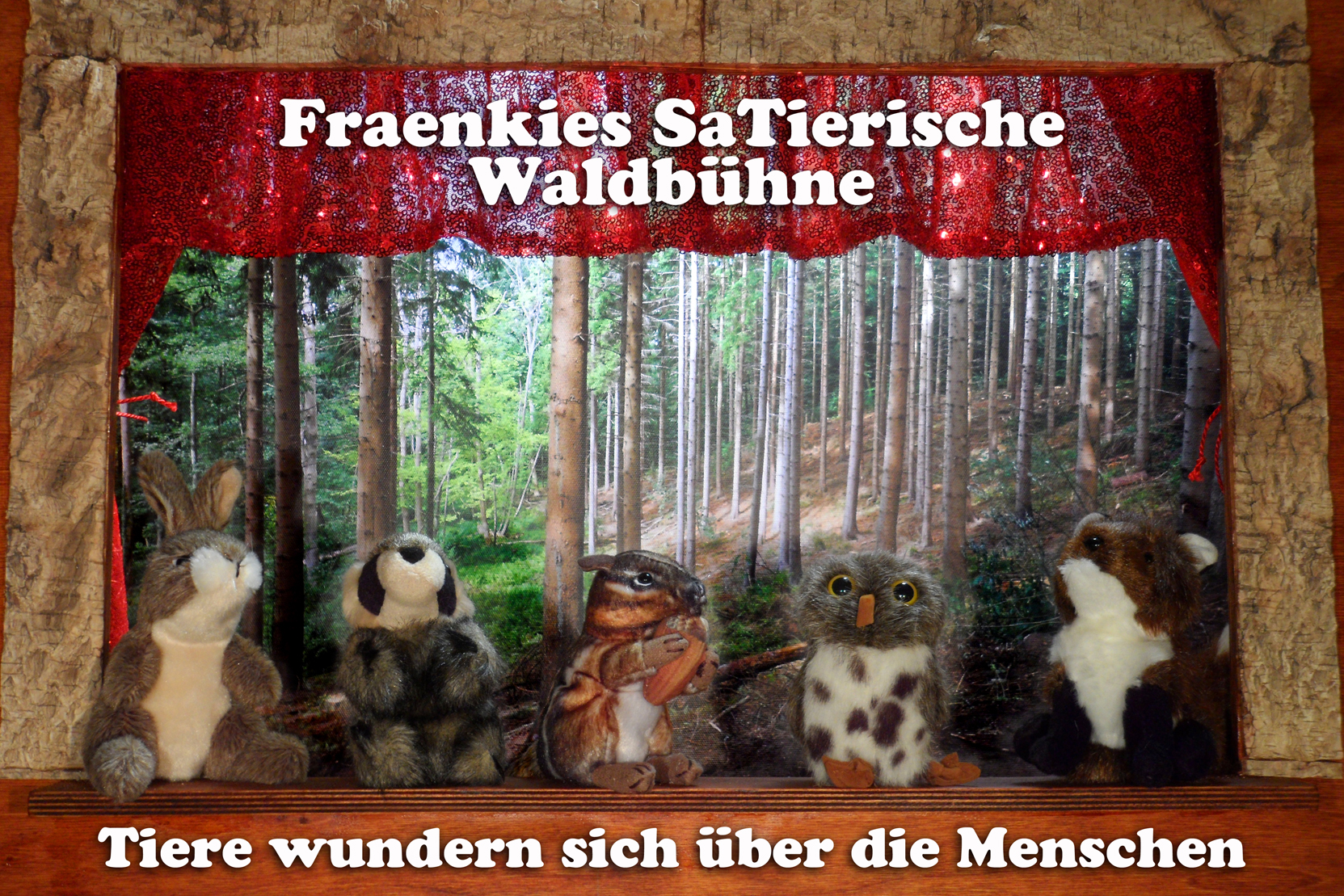 | 2023, 15. Januar | Aus Materialien, die bei mir sinnlos in den Ecken herumstanden, habe ich eine kleine Puppenbühne gebastelt. Eigentlich war sie als Probebühne gedacht, um Stücke für unser großes Kasperletheater einzuüben. Spontan erinnerte ich mich aber daran, dass ich irgendwann einmal überlegt hatte, ein Tiertheater ins Leben zu rufen. Die aktuellen Situationen auf der politischen Weltbühne, sowie unsere honorablen, teils unfähigen Regierungsmitglieder weckten in mir das Bedürfnis, dazu durch die Sichtweise von Tieren hemmungslose Kritik zu üben und Missstände unbarmherzig anzuprangern. Nun ist sie fertig, "Fraenkies SaTierische Waldbühne". Die Schauspieler sind bereits unter Vertrag. Das Equitment (Musik, Licht, Bühnenbild) wird gerade gestaltet. Wann Premiere ist..? Ich hoffe bald! | ||||||||||||||||||||||||||||||